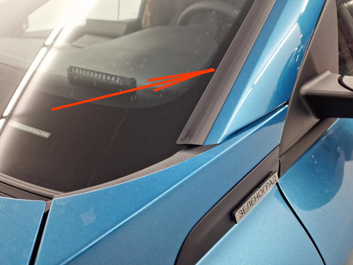 Маленький бортик вставить под уплотнитель лобового стекла и постепенно поднимать вверх до полной установки. При необходимости поддеть уплотнитель острым предметам (отвёрткой).