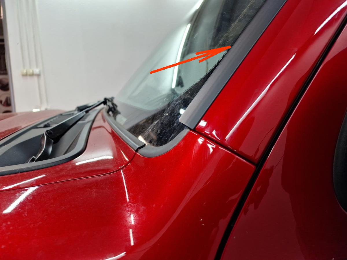 Маленький бортик вставить под уплотнитель лобового стекла и постепенно поднимать вверх до полной установки. При необходимости поддеть уплотнитель острым предметам (отвёрткой).