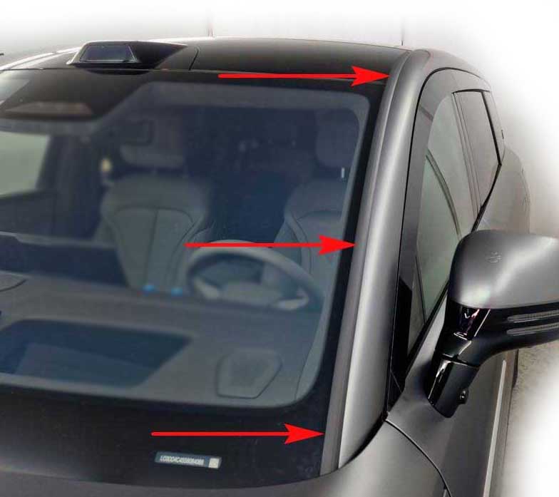 Маленький бортик вставить под уплотнитель лобового стекла и постепенно поднимать вверх до полной установки. При необходимости поддеть уплотнитель острым предметам (отвёрткой).